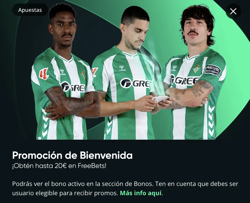 - Nombre de la promoción: ¡Obtén hasta 20 € en Free Bets!
