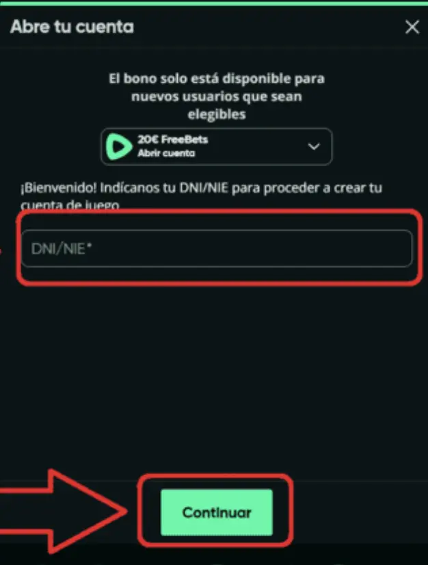 - Verificación de identidad: Indica tu DNI o NIE. Lo usaremos para verificar si eres un usuario nuevo o si ya tienes una cuenta en alguno de los cuatro portales de juegos y apuestas gestionados por nuestro operador, la empresa PAF International PLC, en España.
