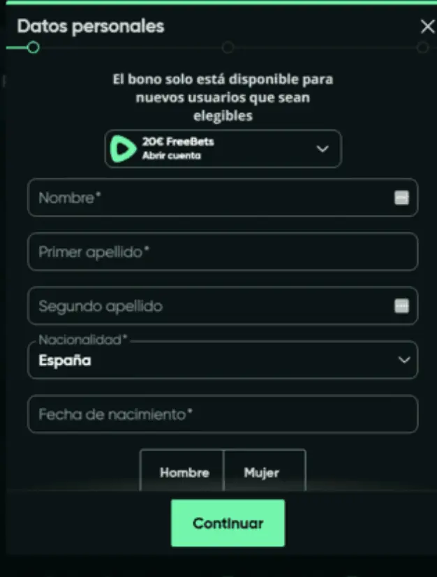 Con el primer depósito obtendrás la primera free bet de 5 €, y para el segundo la free bet de 15 €. Otros requisitos son: