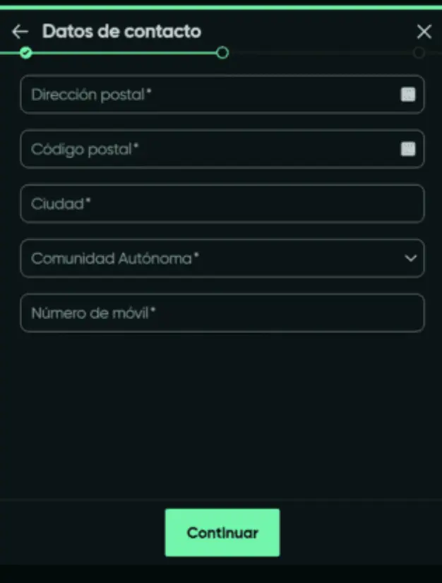 - Relleno de datos personales: Si eres cliente nuevo, rellena los formularios indicando datos personales, residencia y credenciales para futuros login.