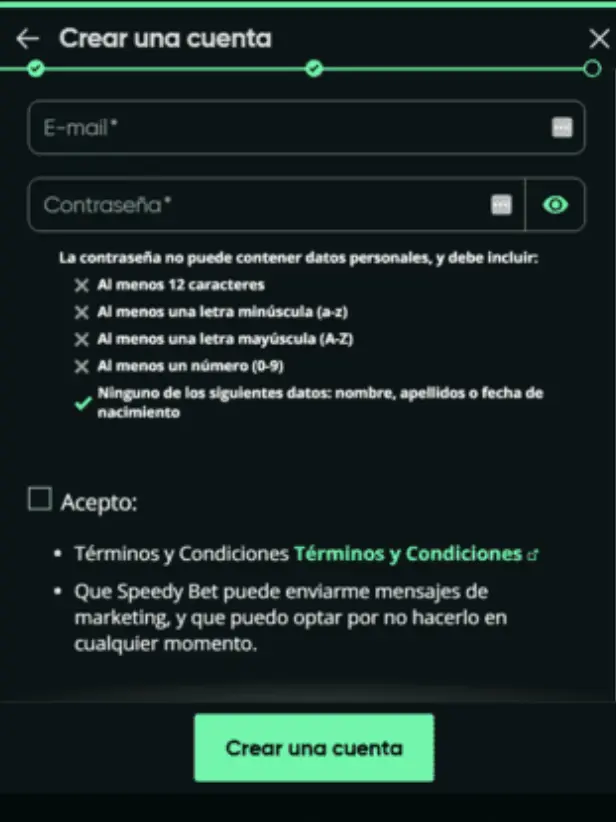 Para ejecutar el proceso de Speedy Bet crear cuenta, completa los formularios, así: