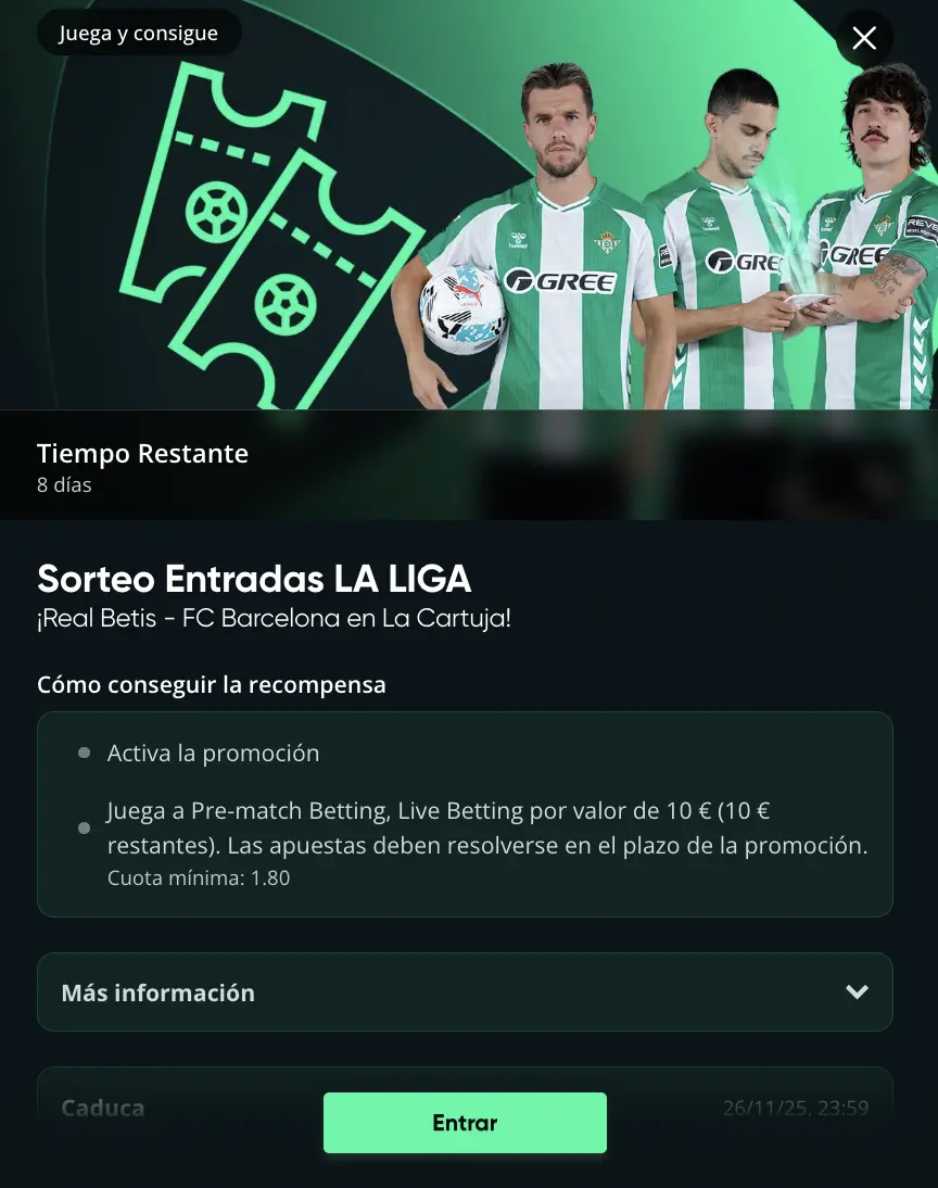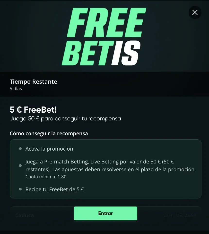 | Free Betis | 5€ Free Bet | Sin depósito | Activación con apuesta 50€ en pre-match o en vivocon cuota mínima 1.80 Free Bet válida x 3 días |